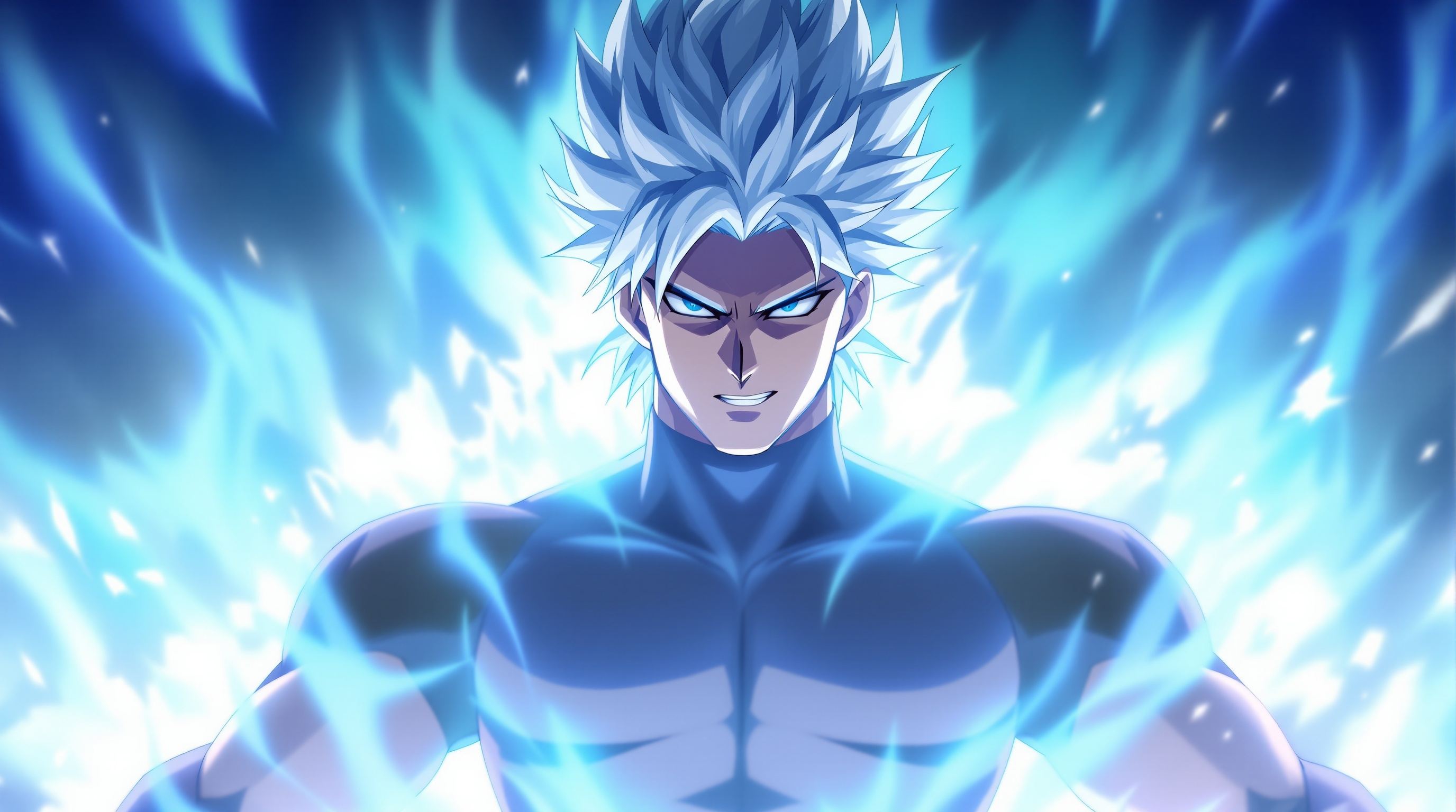 The portrait combines bold anime lighting and confident posture.