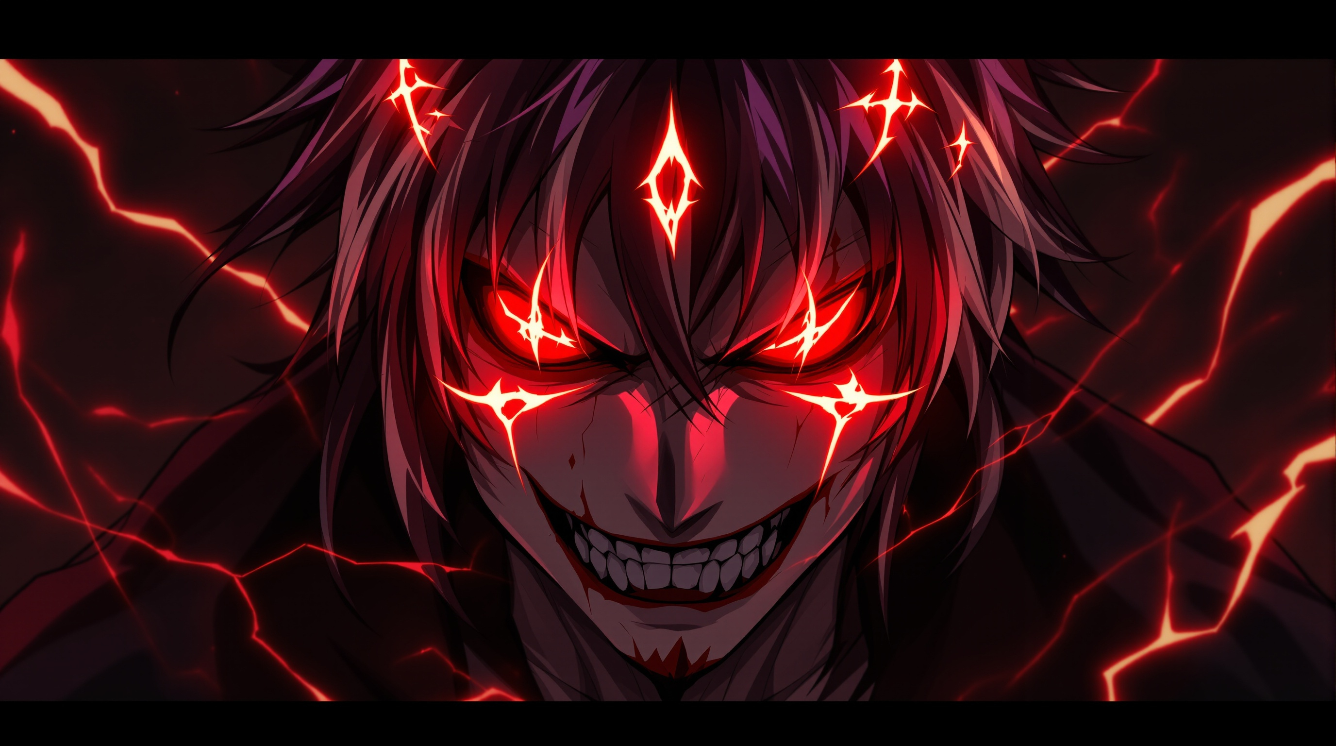This Sukuna PFP focuses on the iconic curse markings that define the character in Jujutsu Kaisen. The anime portrait emphasizes sharp facial features, glowing eyes, and powerful cursed energy surrounding the character. Bold anime shading and deep shadows create a menacing atmosphere while the centered composition keeps the face visible for profile picture use.